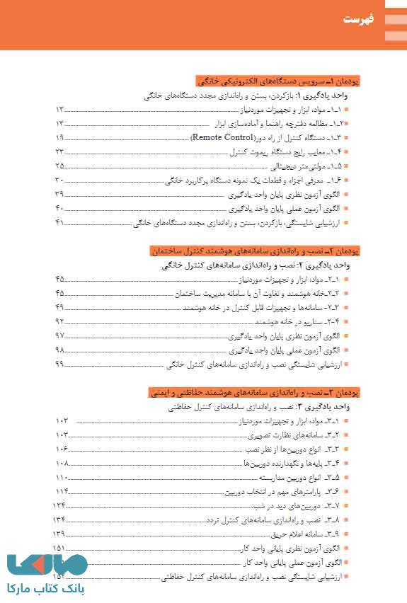کتاب نصب و سرویس دستگاه های الکترونیکی خانگی از بخش های مختلف و متنوعی تشکیل شده است که هر بخش به موضوع منحصر به فردی اشاره دارد. کتاب نصب و سرویس دستگاه های الکترونیکی خانگی از 5 پودمان تشکیل شده است که هر پودمان دارای واحد های یادگیری مختلفی است که در ادامه به بیان آن ها پرداخته ایم.