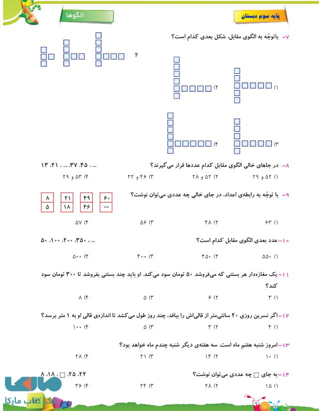 کتاب ریاضی تیزهوشان سوم ابتدایی و بخش های آن در اینجا قصد داریم به بیان بخش های موجود در کتاب ریاضی تیزهوشان سوم ابتدایی بپردازیم. کتاب ریاضی تیزهوشان پایه سوم ابتدایی شامل 8 بخش می باشد که هر کدام از بخش ها شامل زیر عنوان های دیگری چون طرح درس و یا درس نامه، سوال های مختلف و متعدد چهار گزینه ای، آزمون های جامع، پاسخ نامه و …. اشاره کرد که هر کدام متناسب با مطالب موجود در کتاب درسی مطرح شده اند. لازم به ذکر می باشد که بخش های نامبرده در کتاب ریاضی تیزهوشان پایه سوم ابتدایی ویژگی های منحصر به فرد و مزیت های متعددی دارند که در ادامه به بیان آن ها پرداخته ایم.
