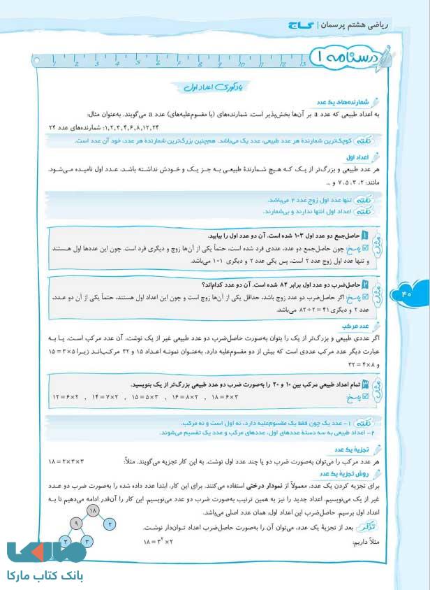 درسنامههای آموزشیشروع هر درس از کتاب کمک درسی ریاضی هشتم سری پرسمان، با درسنامههای آموزشی است که به زبانی ساده به بیان مطالب درسی پرداخته است. این درسنامهها تمام نکات درسی را پوشش میدهند و همراه با مثالهای ساده و کاربردی، فهم مطالب را آسان میکنند.