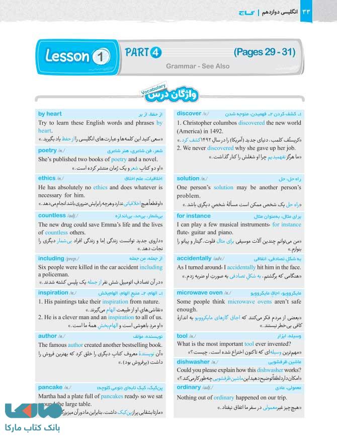 کتاب کمک درسی زبان انگلیسی دوازدهم سری پرسمان، به ترتیب به تمام درسهای کتاب درسی زبان انگلیسی دوازدهم پرداخته است. در ابتدای هر درس و قبل از شروع درسنامه مربوط به آن درس، واژگان مهم و جدید درس به همراه ترجمه و مثالی از کاربرد واژه مربوطه در جدولی مشخص ارائه شده است. همچنین کلمات مترادف و متضاد نیز در جدولی مجزا برای مطالعه دانشآموزان قرار داده شدهاند. سپس، ترجمه کامل متن درس به طور دقیق و قابل فهم نوشته شده است؛ به طوری که بخشهای مربوط به گرامر درس نیز در متن مشخص شدهاند. در ادامه، درسنامه مربوط به آموزش گرامر درس را به طور کامل و به همراه مثالهای مفید و کاربردی خواهیم داشت.