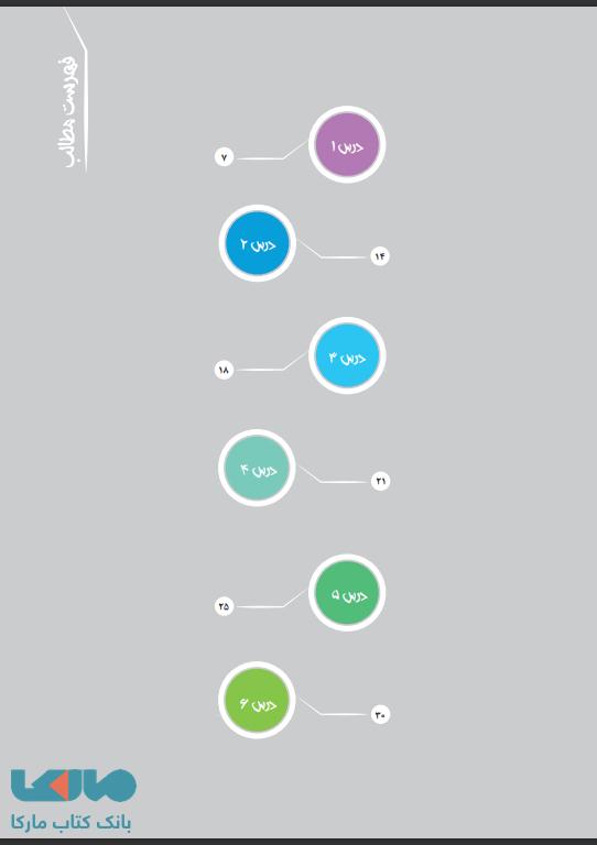 سپس با ورود به درون کتاب با بخش فهرست آن مواجه خواهیم شد. این بخش نیز با استفاده از طرح ها و رنگ های مختلف نقشه ی کلی کتاب را نشان می دهد. لذا مشخص می شود که این کتاب دارای 12 درس بوده و در انتها نیز یک پاسخ نامه دارد. تا این جای کار اگر قصد تهیه و خرید این کتاب را دارید، تنها کافی است به بانک کتاب مارکا مراجعه کنید.