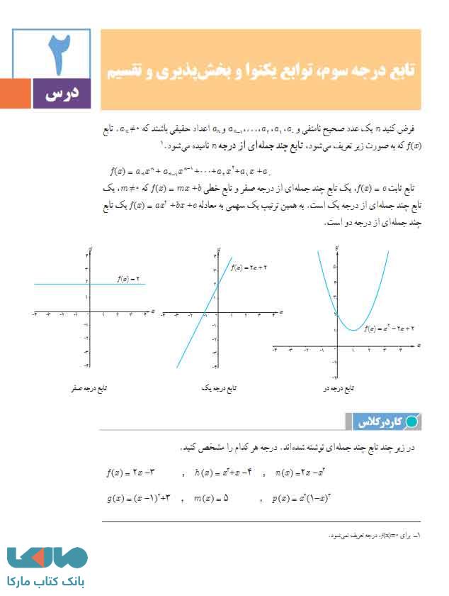 فصل اول : فصل اول موجود در این کتاب تحت عنوان تابع می باشد و از 2 زیر عنوان تشکیل شده است که هر کدام به تدریس مطالب مختلفی پرداخته اند. درس اول موجود در این بخش به تدریس تبدیل نمودار توابع و همچنین درس دوم به تدریس تابع درجه سوم، توابع یکنوا و بخش پذیری و تقسیم پرداخته است. حجم این فصل تقریبا 23 صفحه می باشد.