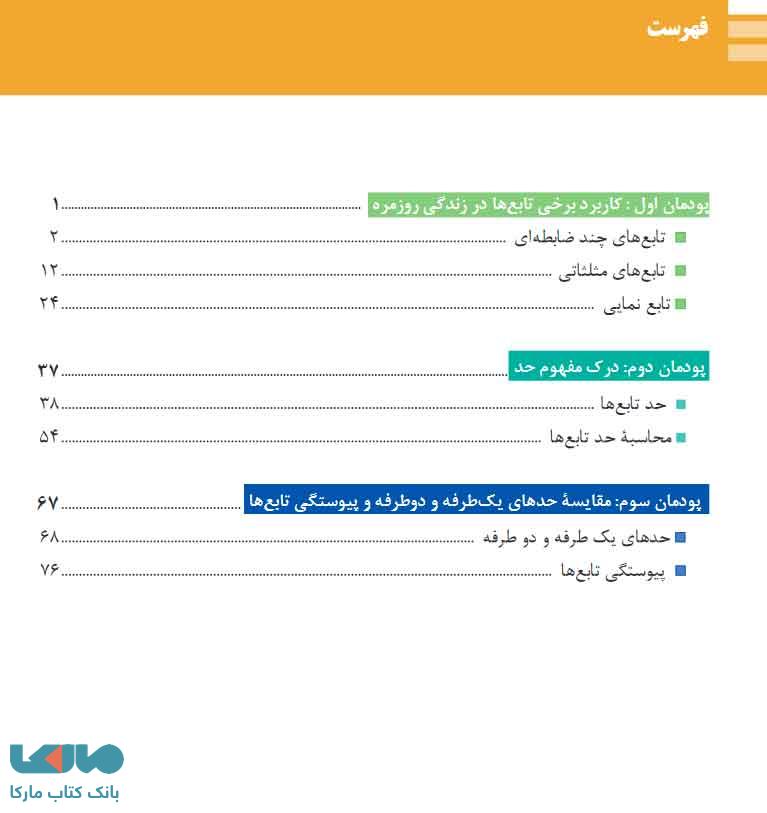 پودمان اول : کاربرد برخی تابع ها در زندگی روزمره عنوان پودمان اول موجود در این کتاب می باشد. این پودمان شامل سه زیر عنوان است که زیر عنوان اول به بیان تابع های چند ضابطه ای، زیر عنوان دوم به بیان تابع های مثلثاتی و زیر عنوان سوم و یا آخر به بیان تابع نمایی پرداخته است. این فصل از صفحه 1 شروع می شود و تا صفحه 37 ادامه دارد. این پودمان با بررسی برخی از پدیده های روزمره مانند جزر و مد و …. به بیان برخی از تابع ها، نحوه محاسبه آن ها، نحوه رسم کردن تابع های مختلف مانند تابع های مثلثاتی، نمایی و …. پرداخته است.
