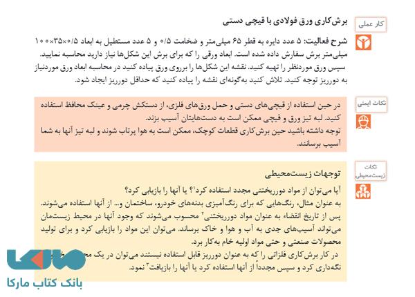 شما جهت یادگیری بهتر مباحث ارائه شده در کتاب ساخت مصنوعات فلزی سبک دهم صنایع فلزی، میتوانید از کتاب همراه هنرجو استفاده کنید. همچنین میتوانید با خرید کتاب کمک درسی و مطالعه آن در کنار این کتاب، به تمام مباحث مسلط شوید.