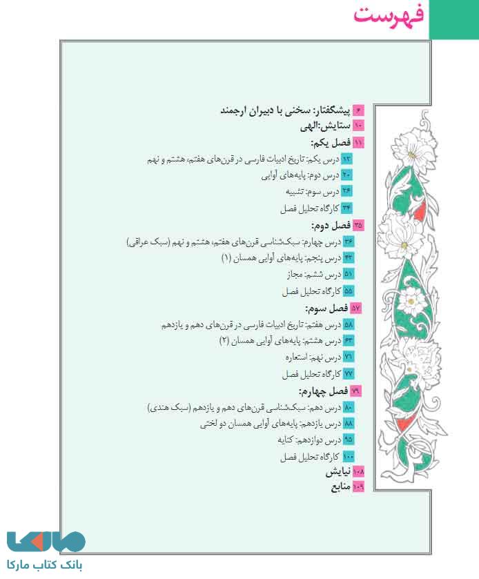 فصل اول موجود در این کتاب تقریبا از 35 صفحه تشکیل شده است و دارای سه درس با عنوان های مختلف می باشد. در انتهای این فصل بخشی تحت عنوان کارگاه تحلیل فصل قرار گرفته است. درس اول موجود در این فصل با عنوان تاریخ ادبیات فارسی در قرن، درس دوم با عنوان پایه های آوایی و درس سوم با عنوان تشبیه در این فصل قرار گرفته اند.