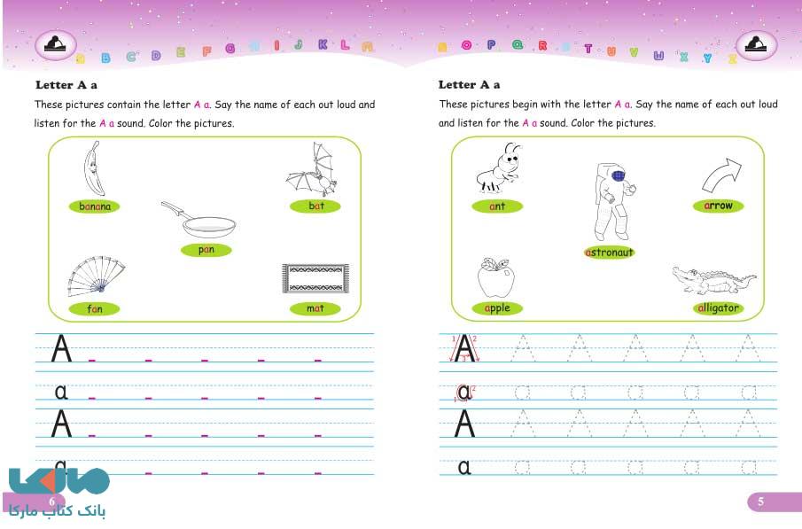در این کتاب سعی شده است که مثال های مختلف و تصویری برای آموزش حروف به دانش آموزان ارائه شود که دانش آموزان با مثال های هر یک از حروف انگلیسی هم آشنا شوند. همچنین، والدین و مربیان می توانند برای کمک به یادگیری دانش آموزان، علاوه بر یاد دادن نحوه نوشتن حروف، به آن ها نحوه تلفظ کردن حروف انگلیسی و صداهای آن ها را نیز آموزش دهند.